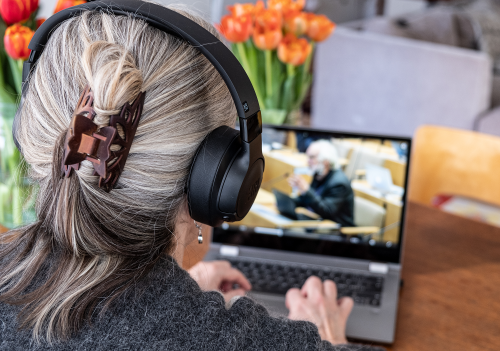 Seniori seuraa lahetysta tietokoneella